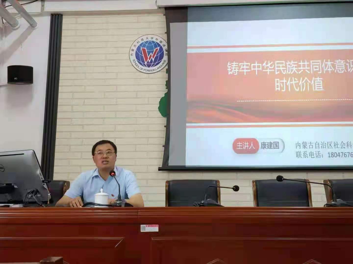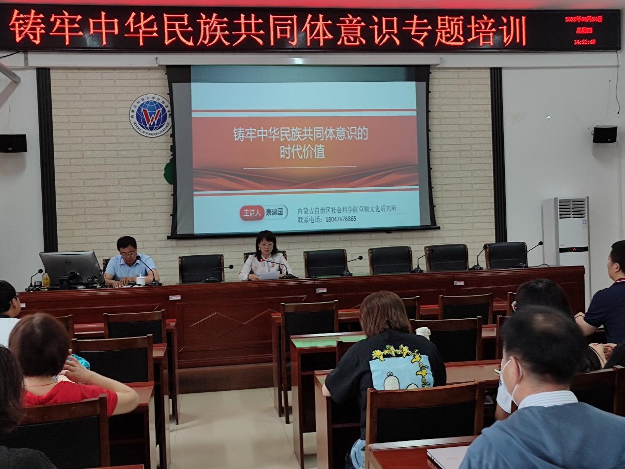 6月24日下午,William威廉英国官网邀请内蒙古社会科公司草原文化研究所康建国研究员为公司全体教师、员工党员、员工干部做了题为“铸牢中华民族共同体意识的时代价值”的专题培训,外国语公司党总支书记张利敏主持专题培训。