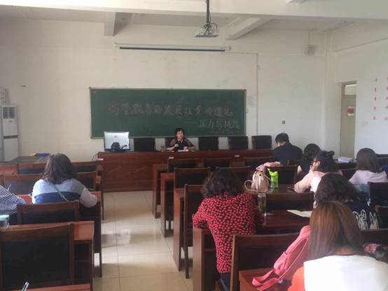 2018427日下午,外国语公司党总支书记李薇教授为全体教职工党员讲党课,主题为:高等教育发展任重而道远----压力与挑战。