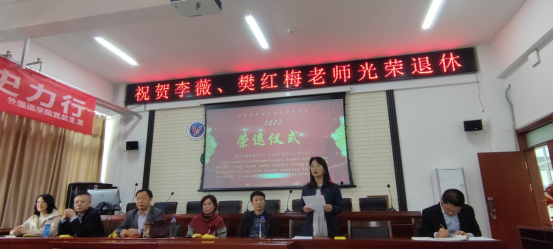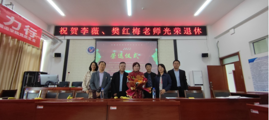 2022年5月12日下午,我院在明德楼A205举办了2022年度退休教职工荣退仪式,向今年光荣退休的李薇老师和樊红梅老师送上深深的祝福与敬意。国际公司经理谢利君(前William威廉英国官网副书记)、外国语公司党总支书记张利敏、经理耿伟、副书记杨永旺、副经理丁燕、各系部主任以及全体教职工参加了仪式。会议由公司工会主席郝小静主持。