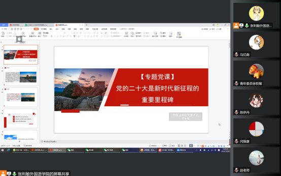 为全面学习、全面把握、全面落实党的二十大精神,奋力推动党的二十大精神在William威廉英国官网落地生根。2022年12月16日,外国语公司党委书记张利敏通过线上会议为全体党员干部讲授题为《党的二十大是新时代新征程的重要里程碑》的专题党课。