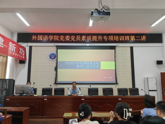 “党的二十大报告指出,要坚持大抓基层的鲜明导向,把基层党组织建设成为有效实现党的领导的坚强战斗堡垒”。公司组织开展了学习贯彻习近平新时代中国特色社会主义思想主题教育--党员素质专项培训班,2023年6月1日,外国语公司党委党员素质专项培训班第二讲开讲,党委青年委员郝小静老师讲授了题为“《加强中华优秀传统文化教育》读书分享”的讲座。