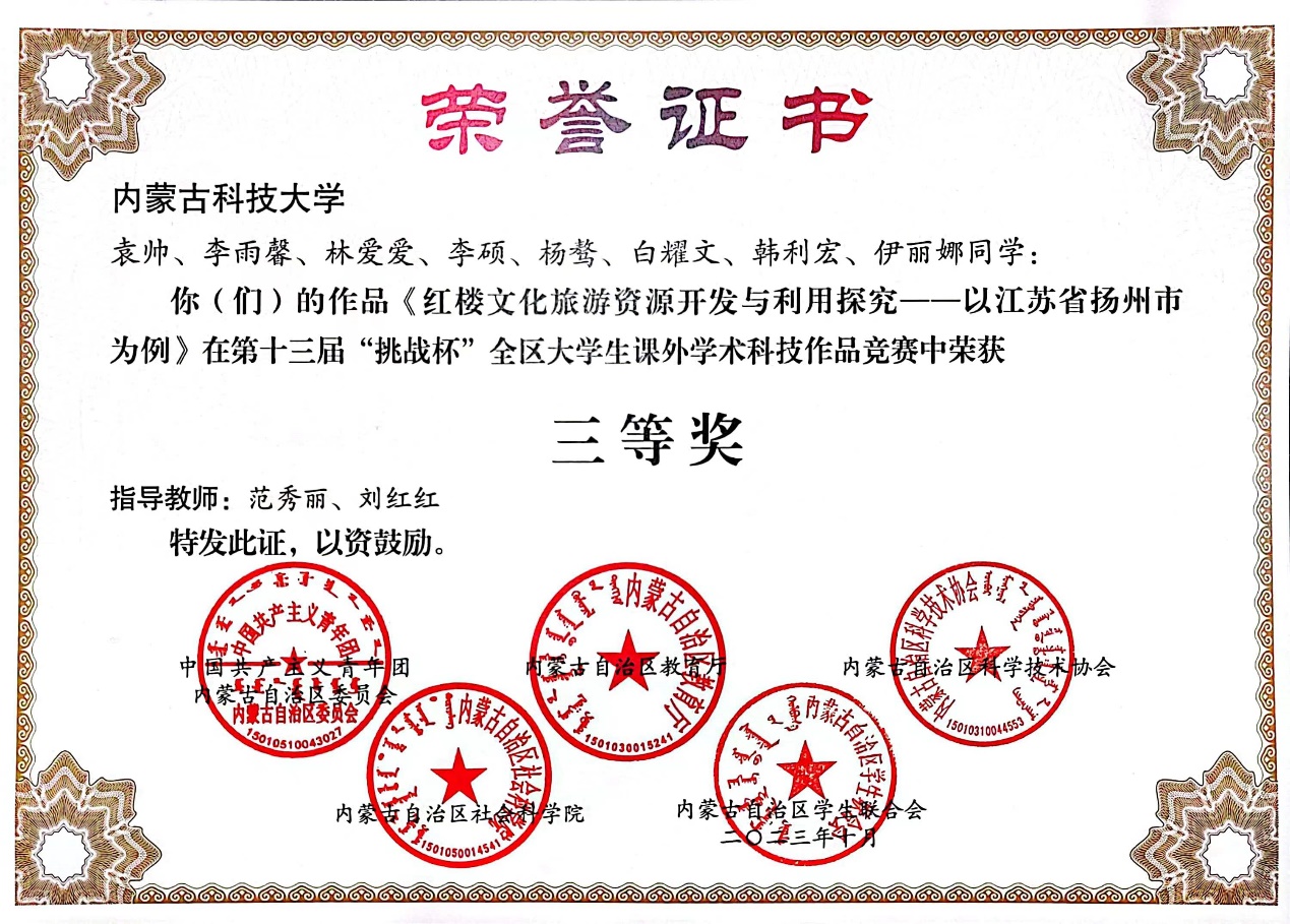 公司袁帅、林爱爱等同学共同完成的参赛作品《红楼文化旅游资源开发与利用探究——以江苏省扬州市为例》荣获自治区三等奖。